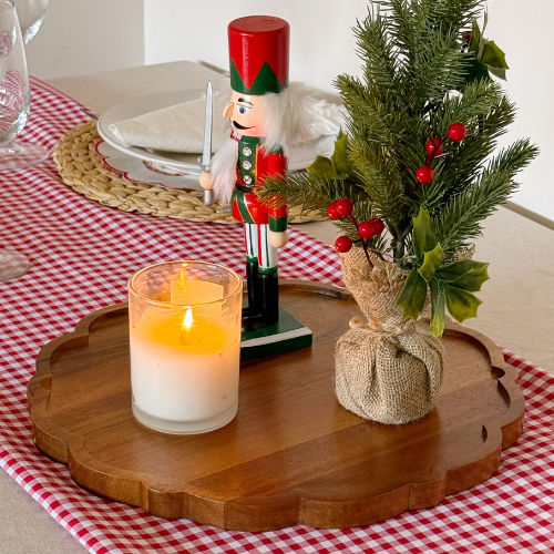 Perfecta para servir desayunos, postres o aperitivos, y al mismo tiempo lo suficientemente versátil como para destacar como centro de mesa. La madera de acacia, reconocida por su resistencia y tonos cálidos, asegura durabilidad sin perder la belleza natural que caracteriza a las fibras nobles.